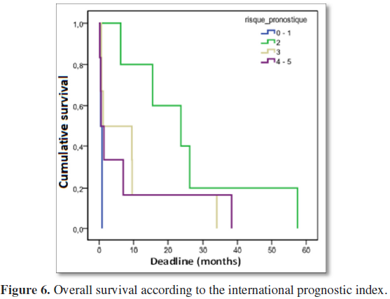 In our study, there was no statistically significant difference between overall survival and international IPI prognosis index (P=0.1). For an IPI between 0-1 the median survival was 0.5 months, for an IPI at 2, the median survival was 23.8 months; for an IPI at 3, the median survival was 1.2 months and for an IPI between 4-5, the median survival was 0.6 months (Figure 6). Death was observed in 12 cases, 24.5%. It was renal disease in 1 case (8.3%), anemia in 3 cases (25%), infections in 2 cases (16.6%) and 6 cases (50%) for which cause of death was indeterminate.