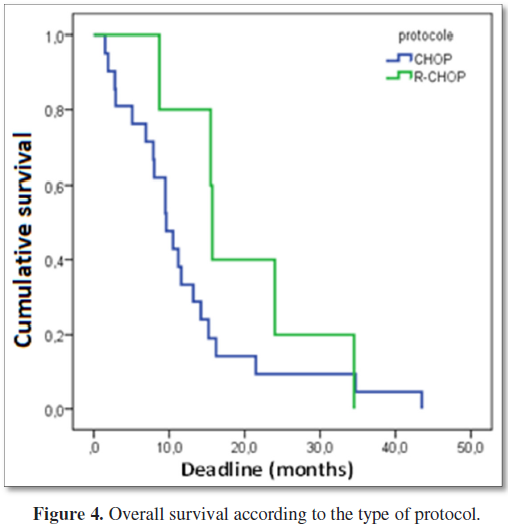 The median survival for the CHOP protocol is 9.6 months whereas for the R-CHOP protocol it is 15.7 months. Li et al. [19] in China in 2012 showed a median survival for the CHOP protocol of 70.2% and 84.1% for the R-CHOP protocol. The Chinese study found that R-CHOP provided a greater benefit of survival in the initial treatment of DLBCL [19]. This result comforts us that the addition of rituximab to chemotherapy would significantly improve the clinical outcome of patients with DLBCL [5].
