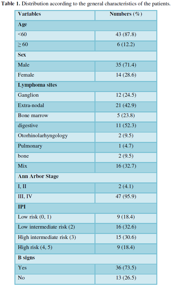 Patients and methods: In a retrospective descriptive and analytical study, we studied the medical records of 49 patients with diffuse large B-cell lymphoma between 2007 and 2016 in the Department of internal medicine of the DGH (hematology unit). We studied treatment response, overall survival, event-free survival, and event-related survival (relapse). Data was analyzed using univariate and multivariate analyses.