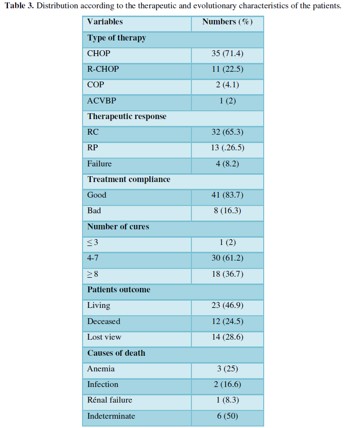 It was also noticed that 30 patients received 4-7 courses of chemotherapy while 18 received at least 8 courses of chemotherapy. The unfinished treatment could be explained by the feeling of being cured when the general condition improves and/or the mass disappears. We recommend that routine use of rituximab immunotherapy be combined to CHOP (R-CHOP) as an appropriate alternative. However, the price of the anti-CD 20 monoclonal antibody (CFAF 836,000 per 500 mg bottle) remains high for Cameroonians who do not have health insurance. We agree with some authors that it is necessary to develop a Europe - Africa or America-Africa partnership to better specify the diagnosis of lymphoma and to propose an adapted treatment, this in view of the insufficiencies in human resources, infrastructures and financial [17].