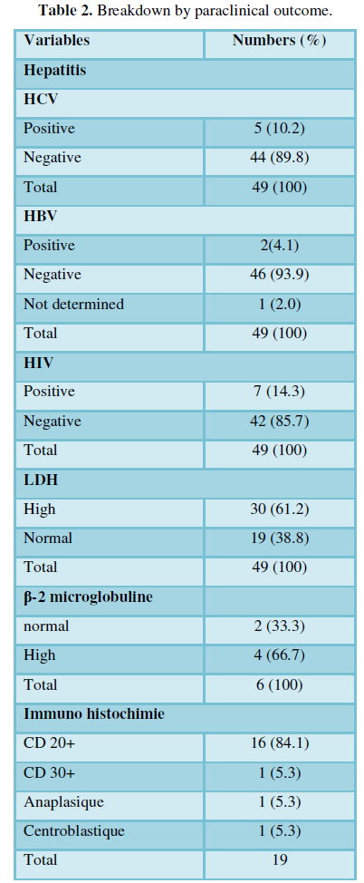 Immunohistochemistry was performed in 19 patients out of 49. The CD 20 receptor was found in 84.2% of cases. Ngouadjeu et al. [14] in 2016, in a series of 44 patients with extra nodal lymphoma counted 6 patients who achieved immunohistochemistry. All patients (63) in the Ivorian study in 2012 had performed immunohistochemistry [8]. The lack of financial means and the lack of adequate technical platform could explain the low frequency of realization of this examination in our context. HIV serology was positive in 7/49 patients or 14.3%. Some authors have noted that HIV infection and immunosuppression increases the risk of developing cancer in general and lymphoma in particular [8].