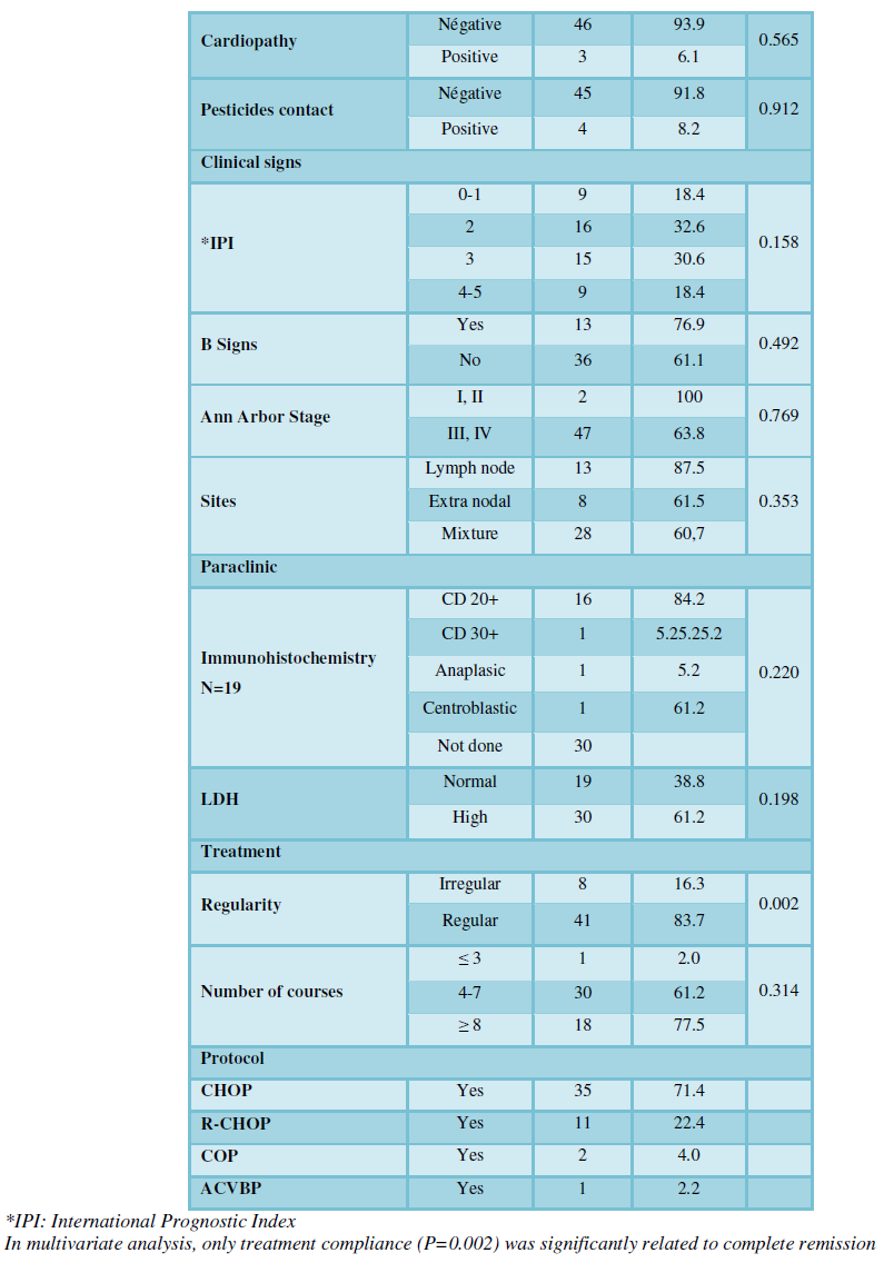 Treatment regularity was associated with complete remission (P=0.002). Tolo et al. [8] found factors associated with complete remission to be associated to the Ann Arbor stage, to the biological symptoms, to international prognostic index, and the socio-economic level. Treatment-compliant patients had a high complete remission rate (75.6%), which could be explained by the fact that CHOP was also effective, but the long delay between chemotherapy treatments may be conducive to re-evolution of the disease.