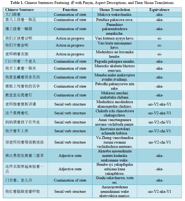 Finally, this paper integrates Dynamic Equivalence Theory, initially proposed by Eugene for translation studies. In language acquisition, dynamic equivalence goes beyond literal, word-for-word matching; it seeks functional parallels that convey similar meanings and effects across languages. Applied to this study, dynamic equivalence helps explain how certain Shona verbal prefixes-such as -aka-, -ri-, or -ngoti--can function similarly to 着 in expressing aspectual nuances. By examining the functional overlap between 着 and these Shona prefixes, educators and learners gain clearer insights into how to bridge grammatical gaps and foster more effective language transfer.