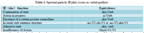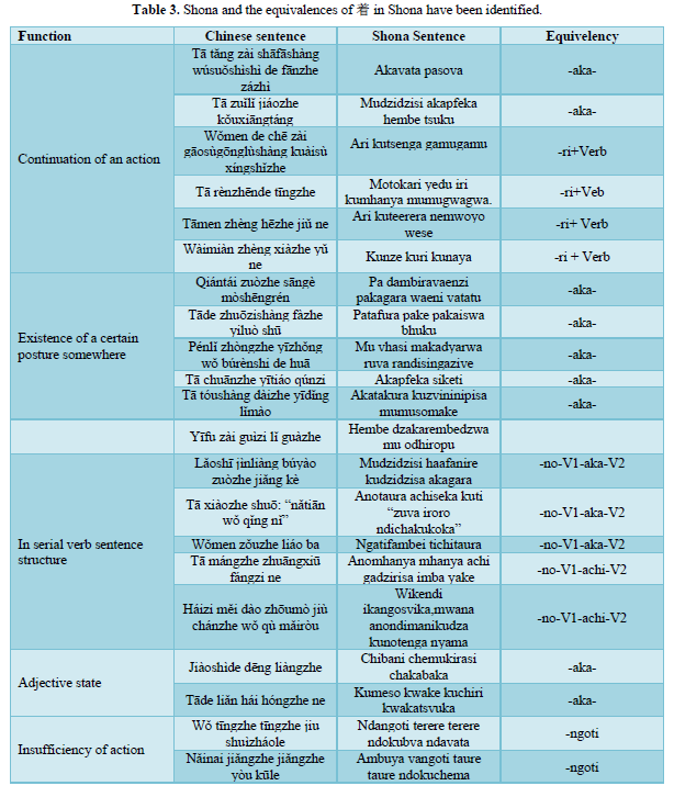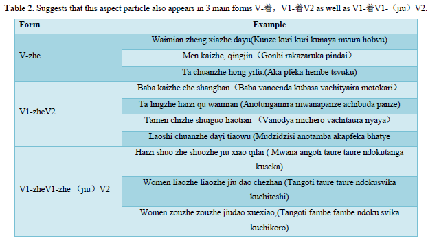 In a nutshell the above analysis shows that that when translated into Shona, the aspectual particle 着(zhe) occurs as verbal prefixes as shown in the Table 4 below:
