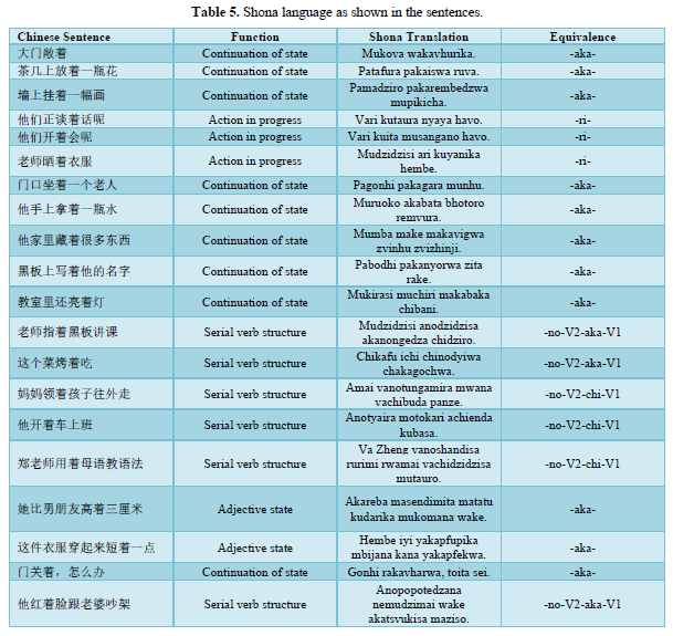 The research results in the above have been tested on the sentences that have been randomly selected. This strengthened the findings of this investigation since all the sentences with the aspectual particle 着(zhe) have been proven to have either of the above prefixes when translated into Shona language as shown in the sentences below Table 5.