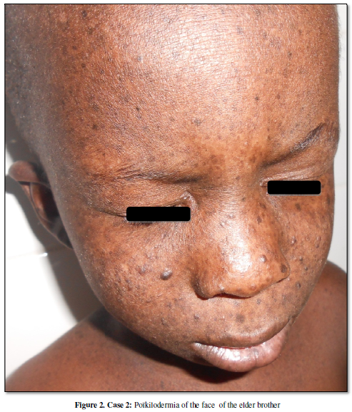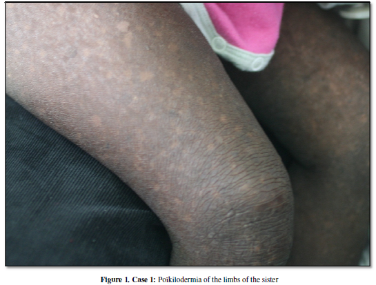Congenital poïkiloderma is rare. It may be the sign of some genodermatosis such as Rothmund-Thomson syndrome, Bloom syndrome, xerodermapigmentosum and congenital dyskeratosis [3]. Poikiloderma-Neutropenia syndrome was described for the first time in 1991 among the peoples from Navajo by Clericuzio. This syndrome is characterized by an eczematous onset of the skin, and secondarily by a poïkilodermal aspect of the skin, which predominates at the extremities with centripetal evolution [4]. It is frequently associated with recurrent bacterial and viral infections and hematological damage characterized by permanent neutropenia, leucopenia and thrombocytopenia. Patients often show a small size, pachyonychia and palmoplantar hyperkeratosis [5,6]. Bone abnormalities as well as malignant transformations have been reported [7]. This dominant autosomal genodermatosis is characterized by a mutation of the C16ORF 57 gene [8,9]. Management is difficult and consists essentially in the prevention of infections. A better understanding of genetic abnormalities will certainly lead to the development of targeted therapies. In this singular observation, the cutaneous manifestations made it possible to specify the etiology of this congenital neutropenia in a brother and sister after several years of diagnostic wandering.