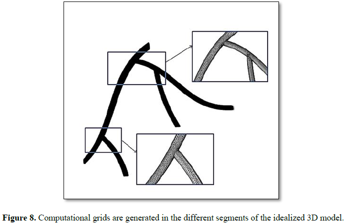Once all the models are prepared, a mesh analysis is performed to find the maximum and minimum mesh required to get accurate results. The models are simulated for one cardiac cycle at various mesh settings until required convergence is achieved (Figure 7, 8). Our idealized 3D model has uniform shape in this case; finite elements mesh generation provides a concise and comprehensive solution over curved surfaces and 3D volume cells. We import the step file under the FEM simulation software where the surface and boundary areas are the unstructured adaptive triangular cells and tetrahedral cells. The mesh settings that are used COMSOL’s predefined finer mesh size for fluid dynamics. Some minor alterations to the mesh settings are performed to remove unneeded elements and nodes, and to increase element density around the apex of coronary artery bifurcation.