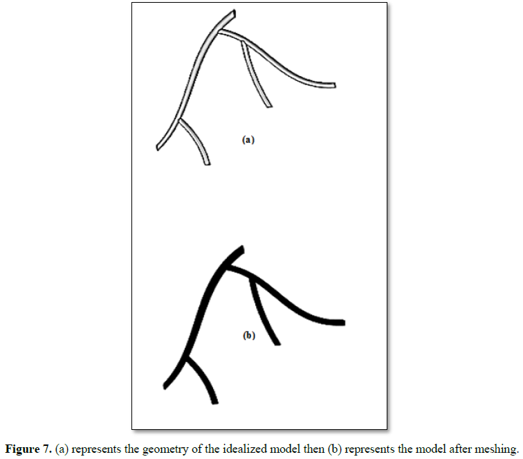To curve the models, we use B-splines which are easy to represent the bending nature of the LAD, LCx arteries and the side branches. For building the arterial tube we use again B-splines with the same center but different radius. Taking the difference of radii, we build the arterial wall that is rigid inside for the blood flow. Using Boolean functions, we can get accurate shapes of the 3D idealized models. In the diseased model the stenoses are generated using the software.