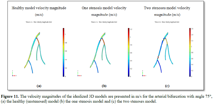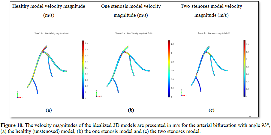 The CFD solver provides the simulation results, with the appropriate physical properties and boundary conditions as described before [30]. The presented solutions in this section rely on information such as which solver is selected and which component the solution applies to (for models with multiple components). Figure 10 shows the velocity magnitudes for the arterial bifurcation with angle 93° of the healthy, one stenosis model and two stenoses idealized model. Figure 11 presents the velocity magnitudes for the arterial bifurcation with the smaller angle 75°, of healthy, one stenosis and two stenoses idealized models. From both Figures 10 and 11, we observe that the upstream and downstream velocity difference is more pronounced in the stenosis area. Again, from Figures 12 and 13, we observe that due to the stenosis in LAD artery, blood velocity is much higher in the stenosis area than other locations (Table 1).