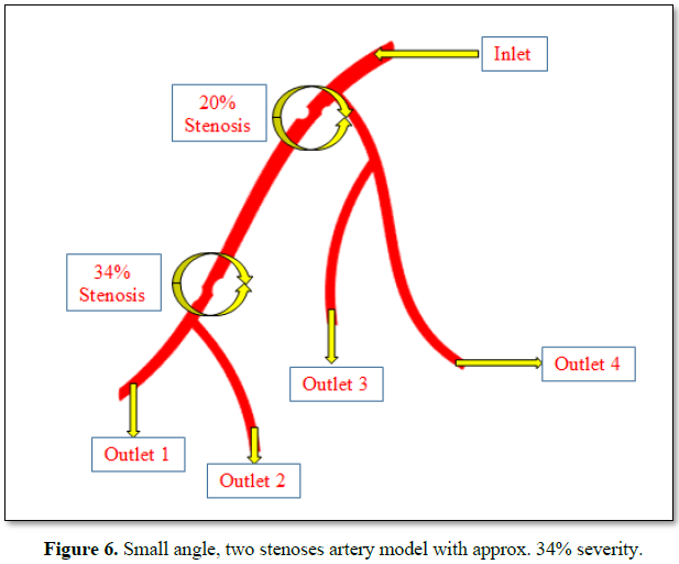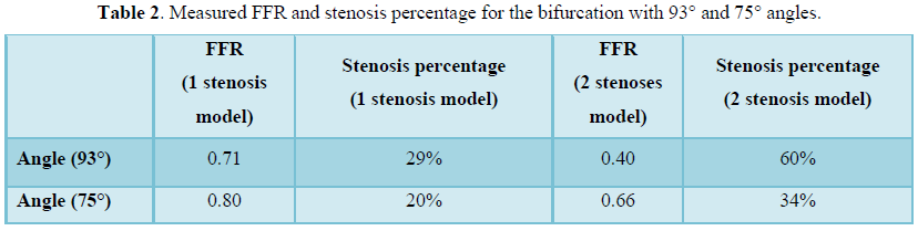 For the arterial bifurcation with the larger angle 93°, we can see from Table 2 that the measured FFR for the one stenosis model is 0.71, which is less than 0.80 and the stenosis percentage is 29%. So, it is not a severe problem. Again, from Table 2 we see that measured FFR for the two stenoses model is 0.40, which is also 0.80 and the stenosis percentage is 60%, which is certainly a very severe problem. For the arterial bifurcation with the smaller angle 75°, we can see from the table that the measured FFR for the one stenosis model is 0.80, which is 0.80 and the stenosis percentage is 20%. It also does not depict a severe problem. Further, from the table we can see that the measured FFR for the two stenoses model is 0.66, which is also less than 0.80 and the stenosis percentage is 34%. So, this depicts a severe problem.