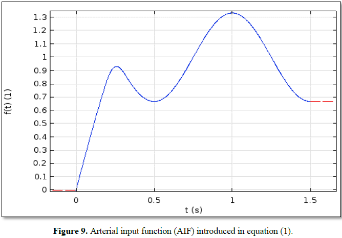 Equation (1) is a simple trigonometric function, is the relative pressure amplitude. During a cardiac cycle the pressure varies between a minimal and a maximal value which are calculated through a relative amplitude, . The first piece of function between 0 and 0.20 s, has no physical significance, it is just a ramp that enable to calculate the initial state. The second piece of function makes the pressure vary between its minimal and maximal value during a 1 s cardiac cycle. The numerical simulations are performed for the blood flows with the area of stenosis around 20% and 60%. The computational results provide the pressure and velocity magnitudes for the idealized coronary artery model. The arterial input function is shown in Figure 9. To simulate the idealized models, we consider two materials; muscle and blood where muscle is set to domain 1 and blood is set to domain 2. Here we employed the blood density as 1060 kg/m3 and laminar flow with the Reynolds number as 140. The Lame parameters relates stresses and strains in perpendicular directions which is closely interacted to the incompressibility and contains a high proportion of information about the resistance to a change in volume caused by a change in pressure. In our study the Lame parameter handles the artificial tube stress and strain of the arterial elasticity. To simulate the idealized models the inlet and outlets follow a Neumann type boundary condition. The walls of the models are set to rigid with no slip condition. At the inlet, we have set the velocity as 16.1 cm/s and at the outlets, we have set the pressure approx. 3 mmHg [30].