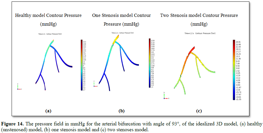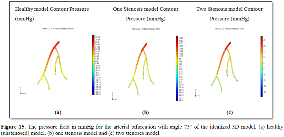 Figures 14 and 15 present the simulation result of the pressure field in the arteries under consideration. Figures 14 and 15 present the pressure gradient in the six idealized models. The relative pressure also represents the physically viable conditions, such as in the healthy (unstenosed) model, the relative pressure in different locations of the model are uniform. The one and two stenoses models refers the pressure differences are very distinguishable between the upstream and downstream flow of the lesion areas [30]. For the arterial bifurcation with angle 95° and angle 75°, we measure the FFR and stenosis percentage that is obtained from the simulation results and the results are shown in Table 2.