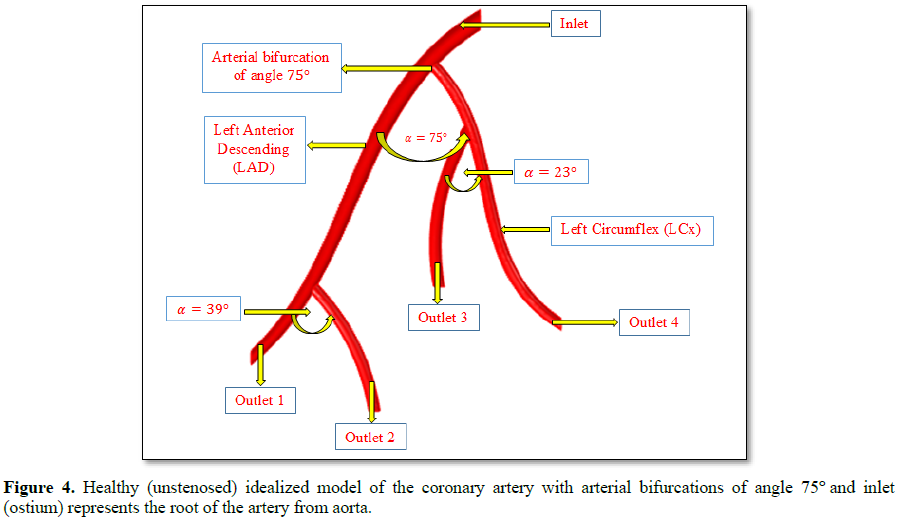 We construct six computational idealized models. The first 3 models are constructed where we choose that the arterial bifurcation is 93°.These 3 models are: healthy (unstenosed) model and two diseased models (one stenosis model and a model with two stenoses). In the healthy (unstenosed) idealized model the measured angle between LAD artery and its side branch is 58° (Figure 1) and the measured angle between LCx artery and its side branch is 35°. We have measured these angles using FreeCAD software. In one stenosis model the first stenosis is located just after the arterial bifurcation where the stenosis severity (area reduction) is approximately 29% (Figure 2). In the two stenoses model, the second stenosis is located above the branch of the LAD artery where the stenosis severity is approx. 60% (Figure 3). For using the finite element method (FEM), it is better to save the model in STEP file format that produces smooth boundary walls with inlet and outlets in the domains of interest. Another set of 3 models are constructed where we choose the arterial bifurcation of angle 75°. Those 3 models are again: healthy (unstenosed) model, (Figure 4) and two diseased models. In the healthy idealized model, the measured angle between LAD artery and its side branch is 39° and the measured angle between LCx artery and its side branch is 23°. In the one stenosis model the first stenosis is located just after the arterial bifurcation where the stenosis severity (area reduction) is approximately 20%, (Figure 5). In the two stenoses model, the second stenosis is located above the branch of the LAD artery where the stenosis severity is around 34% (Figure 6).