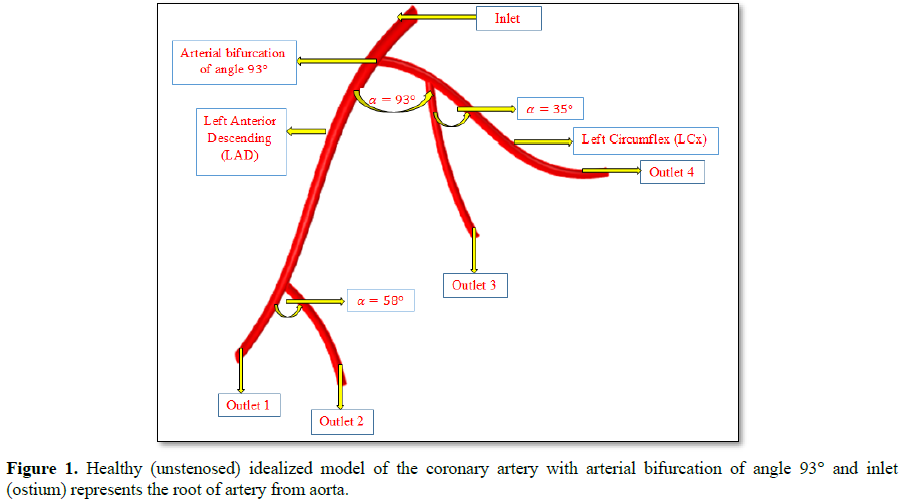 It is quite clear that most of the coronary main arteries are bifurcated everywhere. In the most cases stenosis occurs near the bifurcations or artery bending regions. To describe these characteristics, we construct an idealized model imitating patient-specific computed tomography coronary artery angiography model with different left anterior descending (LAD) and left circumflex (LCx) arteries. In this study, the 3D idealized models are generated by computer-aided design software FreeCAD and then the models are imported into COMSOL Multiphysics software, for grid generation and simulation. The models are made to match images of the coronary artery bifurcation during operations or imaging since no digital scans are available to import into COMSOL. The 3D idealized models are built using FreeCAD software. The idealized 3D model consists of two main arteries which are LAD and LCx, each with one side branch. The length of LAD is 20 cm and the length of LCx is 14 cm. The branch from LAD artery has length 5 cm and the branch from LCx artery has length 7 cm. The structure and dimension of the models are based generally on a typical left coronary artery that follows the anatomically close information.
