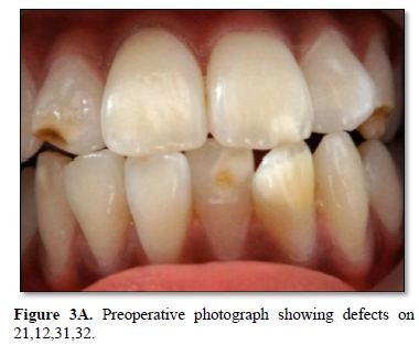 A ten year old boy and his parents reported to our OPD with deep concern about multiple white opacities on upper and lower anterior teeth. On examination it was noticed that WSL on 21,31,32 and frank cavitation on 12 (Figure 3A). The treatment options were explained to parents and they opted for resin infiltration technique. Since there were multiple opacities, parents opted to start with lower anteriors (31,32). Treatment was carried out with resin infiltration on 31 and 32, and cavities were restored with composite restoration (Figure 3B).
