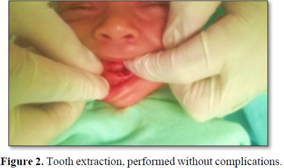 Conclusion: The tooth extraction turned out to be an effective procedure by removing the two incisor neonatal teeth in the lower jaw that the patient had, 2 weeks after extraction the patient evolved favorably without presenting complications.