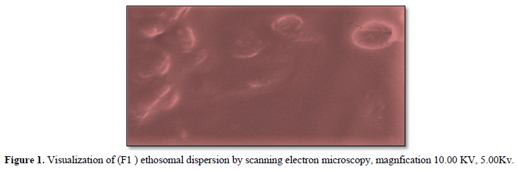 Scanning electron microscopy (SEM) was used to characterize the surface morphology of ethosomal formulation, In SEM image analysis nanosized spherical or near spherical –shaped vesicular structures are clearly observed (Figure 1).
