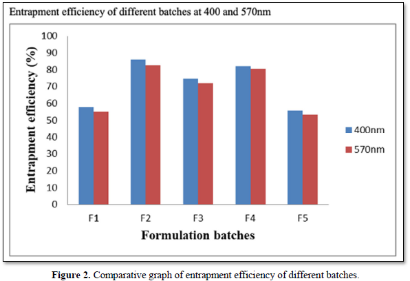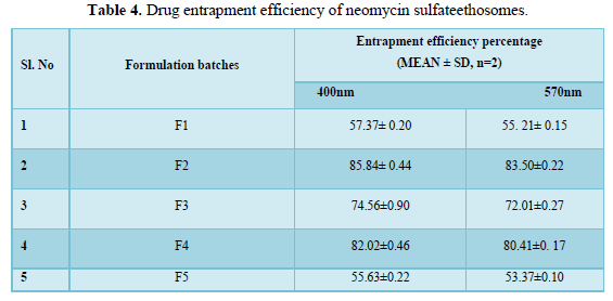Entrapment efficiency (EE) of the ethosomal vesicular systems was determined by ultracentrifugation method. The sediment was lysed with 0.5% w/w (1ml) Triton X-100) and assayed for the drug content by using a Shimadzu 1800 (Shimadzu, Japan) double beam UV spectrophotometer at λmax of 400nm and 500nm where neomycin sulfate showed absorption peaks. The entrapment efficiency of neomycin sulfate in ethosomes was ranging from from 55.63% to 85.84%. F2 showed the highest entrapment efficiency at 85.84% compared to all other formulations (Table 4 and Figure 2).