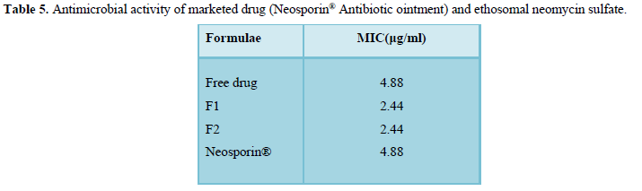 It can be observed from that ethosomal formulations F1 and F2 exhibited a lower minimum inhibitory concentration compared to marketed neomycin sulfate ointment (Neosporin) and the free drug solution of neomycin sulfate (pure drug) (Table 5).