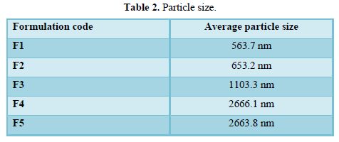The particle size was measured using a Malvern Zeta sizer 300 HSA (Malvern Instruments, UK) at 25˚C.The samples were diluted with water solution. Zeta potential measurements were determined by analyzing the formulation for 60 s using a Malvern Zeta sizer 300 HSA (Malvern Instruments, UK) at 25˚C as given in Table 2 (Zeta potential and polydispersity measurement).