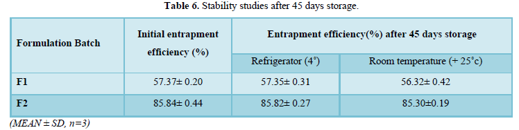 It was observed that on storing the ethosome formulations for 45 days there was no significant decrease in the drug content and presented no changes in visual appearance or aggregation. These results prove the stabilizing effect of higher zeta potential provided by the formulation composition [33-35]. However, the encapsulated drug tends to leak out from the lipid bilayer structure during storage hence the slight observed changes [5-9, 15-18,30-36].