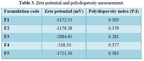 The PDI values of ethosomes formulations lie in the range 0.281- 0.383. With negative zeta potential values as in Table 3.