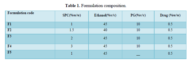 F5 with 1% SPC and no PG however, showed a greater particle size this can be explained from the absence of propylene glycol in its composition. Scientific research reports have showed that incorporation of PG resulted in reduction in vesicle size. The opposite is true for formulations without propylene glycol due to the absence of interaction between PG with the phospholipid bilayer where the enhancer interpenetrates the SPC hydrocarbon chain allowing more bilayer flexibility and hence higher vesicle size [20-23].