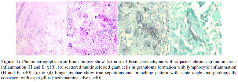 Invasive aspergillosis generally occurs in immunosuppressed patients. It may also rarely occur in immunocompetent individuals. Histopathology along with ancillary fungal stains had proved the diagnosis of invasive cerebral aspergillosis.