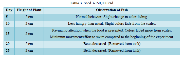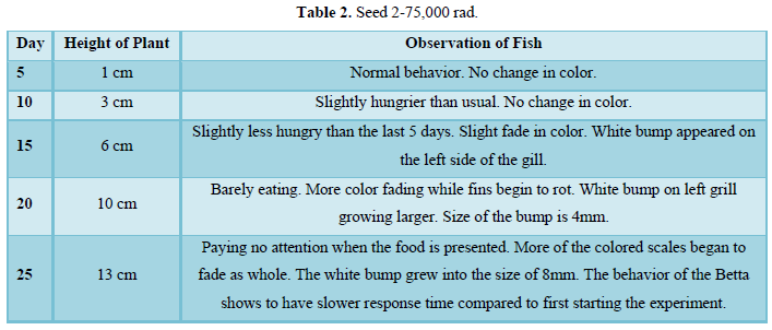 The control tank, displayed in Table 1, created a healthy environment that allowed the kidney bean to grow at a healthy rate and the Betta Splender to prosper. In Table 2, the tank with a kidney bean exposed to 75,000 rad, shows more stunted growth compared to the control tank. The kidney bean did not grow at the same rate or reach the same size noted in the control tank. The Betta fish had similar difficulty thriving in this environment. By the 15th day hunger began to decrease, colors from the scales began to fade, and a white bump grew on the gill. By day 25 the Betta displayed limited mobility and the white bump grew into a thyroid tumor. The tank with the greatest radiation, results exhibited in Table 3, was incredibly harsh for both plant and fish. The kidney bean showed minimal growth, only reaching 2 cm, while the Betta fish was deceased by day 20 and removed from the experiment.