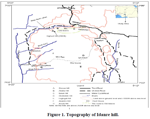 Mountains provide numerous ecosystem services one of which is recreational opportunities during sport of climbing mountains they are storehouses of € biodiversity; support hundreds of millions of people with vital services (Gret-Regamey, Brunner & Kienast, 2012) and its simply one of the finest outdoor opportunities available to the lover of high places. Mountain climbing is challenging and it requires perseverance, it involves putting hands and feet onto rocks and sometimes ice and snow depending on the terrain and prevailing climatic conditions, before finally reaching the peak (Wood, 2014). The climber can pause and look across a natural world ruled by nature and her raw beauty. MARE is one of the notable mountain climbing heritage of sport event in Nigeria. The unique topography of Idanre Hill offer enabling environment for this event to thrive. Idanre hills constitute one of the highest elevated parts of southwestern Nigeria (Afolayan, Agbelusi, Adekayode, Bello-Olusoji & Oladeji, 2007). The hill is characterized by a hilly topography with elevation ranging from about 600 ft (182.88 metres) around the south western corner and 2980 ft (883.92 meters) above sea level at the northwestern corner of the core area of study (Figure 1).