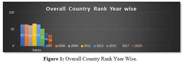 Tourism industry has become an integral part of the Indian economy. It is one of the major service sector industry contributing considerably towards GDP, foreign exchange and employment generation. It is important for the government to develop and support the industry. The travel and tourism competitiveness index is a performance benchmark for the Indian tourism industry. As the index measures the performance of the industry on various parameters therefore it should be used by the private and the public sector for important decision making and analysis. As the index suggest areas where Indian tourism industry is doing well and where there is a need for betterment thus policy makers and service providers should refer to this index and work towards the betterment of the industry. Travel and tourism competitiveness index will help the Indian tourism industry to get an insight on its overall performance and where it stands on the global level. When we talk about increasing our share of world tourism, we will have to make sure that our tourism destinations and tourism products are at par with the major tourism destinations worldwide. The index can help the tourism professionals and policy makers to focus on areas where the country is lagging behind and take necessary measures to improve its performance. India has always been a destination for tourists interested in natural and culturally inclined destination. The diverse cultural and religious background with large number of heritage destinations, different languages and dialect, diverse food and clothing styles has kept its popularity intact among the tourists. Varied flora and fauna make it a paradise for nature lovers and tourists looking for solidarity. The country as a tourist destination is price competitive and is value for money. The tourists in large numbers are able to afford travelling to India as compared to other destinations globally. Over the period of time the tourism destinations in India are becoming accessible to the tourists with improving air and ground transport system. However, the overall tourism infrastructure is still a problem for the country with concerns regarding accommodation facilities and amenities such as ATMs etc. The country is not considered fully safe for tourists and is ranked quiet low in safety and security. Environment sustainability is a challenge for the government with over commercialization and decreasing carrying capacity. Health and hygiene is again a concern point for tourism policy makers. The government is promoting the ease of doing business and supporting budding entrepreneurs through various schemes, exemptions and relaxation. There are schemes to attract foreign as well as domestic investors but still business environment is placed quiet low in the ranking table. It still needs improvement to attract potential investors. The government although seems quite serious towards developing tourism activities in India but it still hasn’t prioritized tourism industry to that level, other countries globally are seen focusing and emphasizing more on tourism growth and development. ICT readiness is again a factor of concern for the country. The country still ranks below average in technological advancement of the tourism industry. Even after launching the mighty Incredible India Campaign in 2002, the advertisement effectiveness quotient still remains low. In the era of digital marketing, social media and other technological advancements the Indian tourism industry needs to catch up with its global competitors. Although there are a number of factors which needs attention of the industry professionals and government of India but still the overall rank has improved considerably over the past few years (Figure 1). The improvement in rank is seen as a result of improving ground and air infrastructure, price competitiveness, diverse cultural and natural tourism destinations and promotional campaigns also playing some role in it.