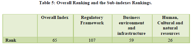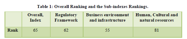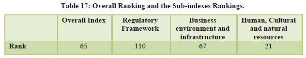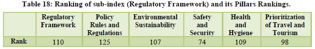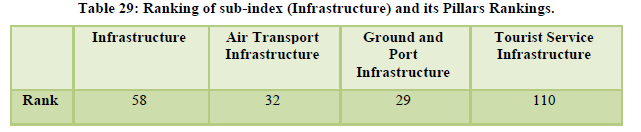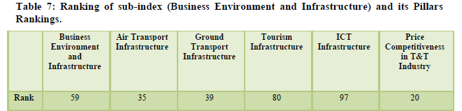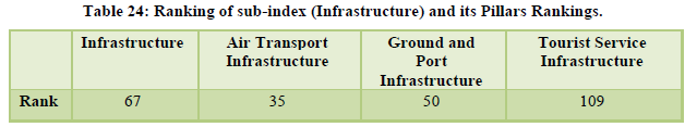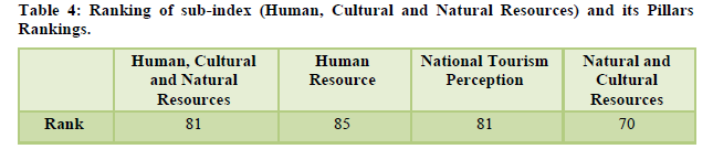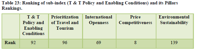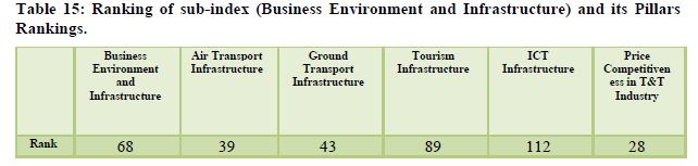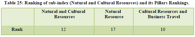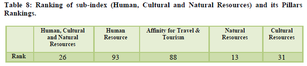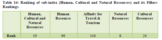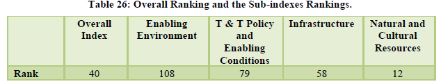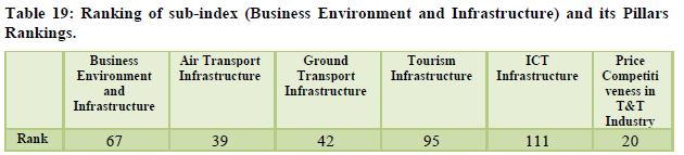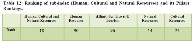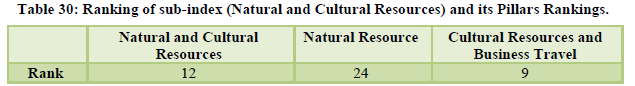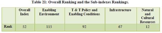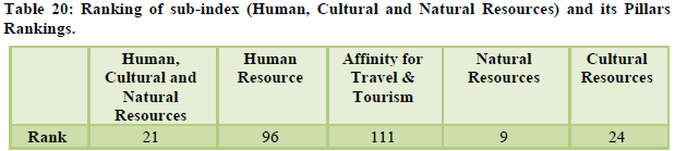 The country managed to keep to hold 65th rank overall, the natural resources were ranked 9th and cultural resources were at the rank 24th (Table 17,18). The ground transport infrastructure was given a ranking of 42 and the air transport stood at 39th position however the quality of ports was ranked 79th and the roads were on 85th position indicating the requirement for improvement (Table 19). The overall tourism infrastructure was ranked at 95th position. The other areas of concern were ICT standing at 111th rank, policy environment which was at 125th position, health and hygiene at 109th rank (Table 20).