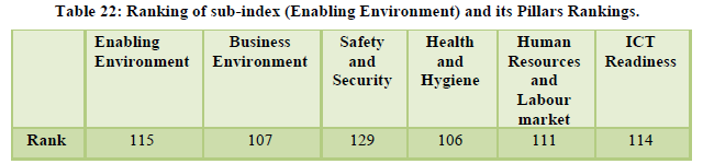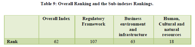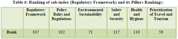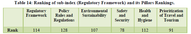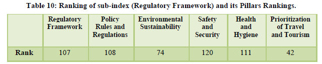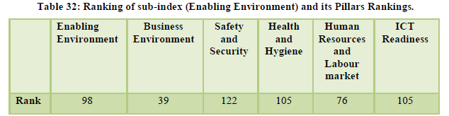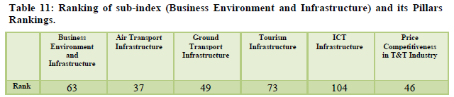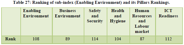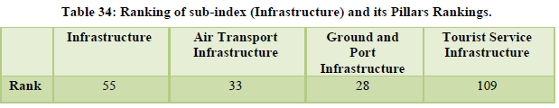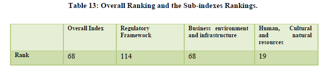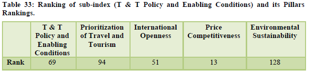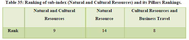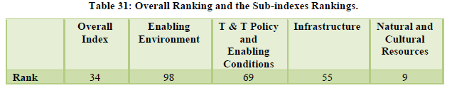 The country moved up by six places to reach the 34th rank globally. International openness was at 51st position, ground and port transport stood at 28th rank while the air transport infrastructure was at 33rd position. The natural and cultural resources were ranked 14th and 8th respectively (Table 31-Table 32). The country’s price competitiveness was ranked at the 13th position however the areas of serious concern for the country are tourist service infrastructure, environmental sustainability and enabling environment ranked 109th, 128th and 98th respectively (Table 33, 34, 35).
