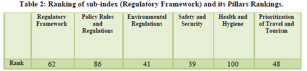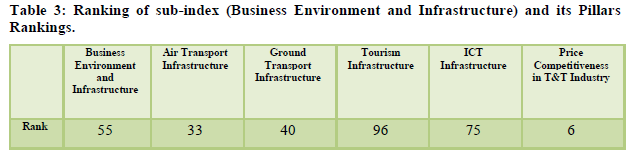 The World Economic Forum published its first ever Travel and Tourism Competitiveness Index report in the year 2007. The Index does not measure the attractiveness of a nation as a tourism destination whereas it is a measurement of the possibility of developing travel and tourism business in that country. The Index is based on analyzing a number of factors that are important for developing a successful travel business at any place, how viable it is for a country to develop tourism business. The world economic forum studies and analyses all such factors and variables for each participating nation individually to come up with a comprehensive and a compiled report of the travel and tourism competitiveness index. The index shows how attractive a country is for investors willing to invest and do business in the travel and tourism industry. Since 2007, which included 124 countries; this report has been published in 2008 including 130 countries, in 2009 covering 133 countries, in 2011 extended to 139 countries and in 2013 there were 140 countries participating for the evaluation. The recent report has been published in 2019covering 140 countries. The report analyses each country under four sub-indexes namely Enabling Environment, T&T Policy and Enabling Conditions, Infrastructure, Natural and Cultural resources. The Enabling Environment then consist of five pillars namely Business Environment, Safety and Security, Health & Hygiene, Human Resource and Labour Market and ICT Readiness. The second sub-index T&T Policy and Enabling Conditions includes four pillars namely Prioritization of Travel and Tourism, International Openness, Price Competitiveness and Environmental Sustainability. The third sub-index which is infrastructure includes pillars namely Air Transport Infrastructure, Ground and Port Infrastructure and Tourist Service Infrastructure (Table 1). The last and the final sub-index is Natural and Cultural Resources which includes two pillars namely Natural Resources and Cultural Resources & Business Travel. The report further consists of 90 indicators spread across different pillars. The report along with the scores of TTCI also includes country profile, key economic indicators by the World Bank and country indicators by the UN World Tourism Organization of each country being evaluated (Table 2). The report acts as a benchmark on which the countries can evaluate and develop its travel and tourism business in comparison to other countries in the world. The report helps in evaluating the areas on which the countries are required to work on so as to develop tourism business in the region to its fullest. The report gives an overall idea of the tourism sector in the country and helps in making investment and policy decisions. It is a source to know about the strengths and weaknesses of the travel and tourism industry in the country. The report till 2013 was divided into three sub-indexes namely T&T regulatory framework, T&T business environment and infrastructure and T&T human, cultural and natural resources and consisted of fourteen pillars namely Policy rules and regulations, Safety and security, Environmental Sustainability, Health and Hygiene, Air Transport Infrastructure, Prioritization of Travel and Tourism, Ground Transport Infrastructure, Price Competitiveness, Tourism Infrastructure, Human Resource, ICT Infrastructure, Natural Resources, Affinity for Travel and Tourism, Cultural Resources. Later on with changing scenario, industry outlook and significant changes in the framework conditions the sub-indexes were divided under four heads.