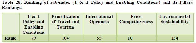 The country stood at the overall 40th position. The natural and cultural resources continue to get high ranking of 24th and 9th respectively along with price competitiveness ranked at 10th position (Table 26, 27, 28). International openness was ranked at the 55th position amid redefined visa policies and e-visa regulations. Ground transport infrastructure stood at 29th rank while tourist service infrastructure and health still remain a concern for India standing at 110th and 104th position simultaneously. The security concerns are ranked at 114th position, ICT readiness at 112th position and the human resource was positioned at 87th position (Table 29, 30).