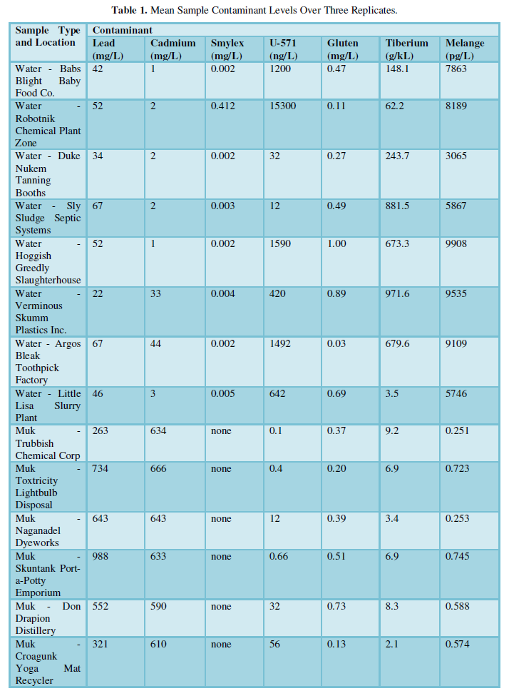 To address the issues of the Muk outbreak, an unbiased and conflict-of-interest free research study was undertaken to compare water quality levels around Gringey City with the contaminations of the Muks loitering around the town, to check if the chemicals match. We hypothesize that, if the environmentalists are correct, then the Muks should have similar biochemistry to the pollutants. If they do not, then their source is external and no changes need to be made and everything will continue to be fine [8].