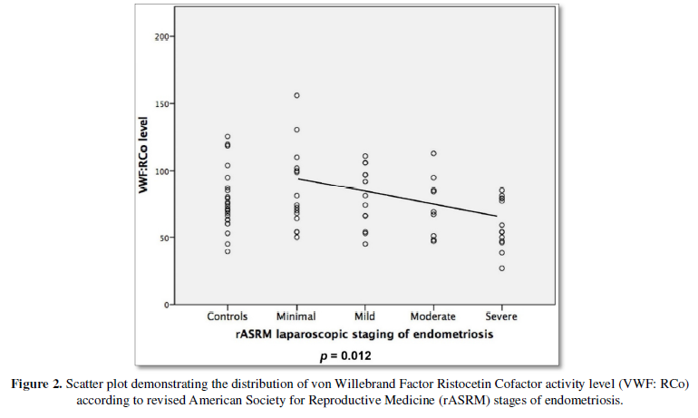 Results: Women with endometriosis had significantly more defects of platelet aggregation to one and multiple agonists compared to controls (31% vs 4%, p = 0.005 and 15% vs 4%, p< 0.05, respectively). VWF level demonstrated a significant downward trend with increasing laparoscopic stage (r = -0.35, p = 0.01). Five women with severe endometriosis had a VWF level < 50 IU dL-1.