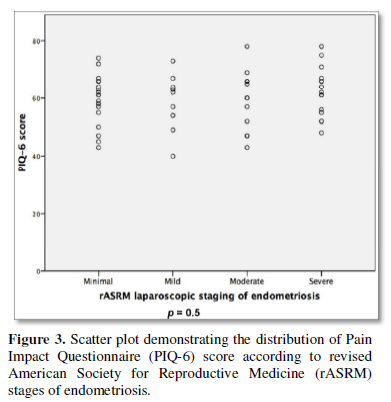 Platelet count was the only hemostatic variable to demonstrate a weak positive correlation with PIQ-6 score in the logistic regression analysis (r2 = 0.031, p = 0.03). In addition, there was no significant difference in PIQ-6 scores in women with abnormal platelet aggregation compared to those without. (Figure 3) shows distribution of PIQ-6 scores across the rASRM laparoscopic stages. No significant trend in PIQ-6 score was detected across the different stages (p = 0.5).