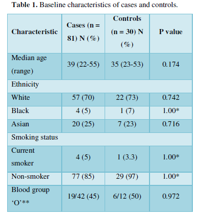 A total of 84 women with a diagnosis of endometriosis were recruited. Three women were excluded from the final analysis as they had a confirmed diagnosis of an inherited bleeding disorder. Thirty asymptomatic women without a diagnosis of endometriosis were recruited as controls. There was no significant difference in age, ethnicity, blood group O, or smoking status between cases and controls (Table 1).