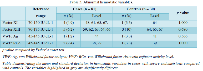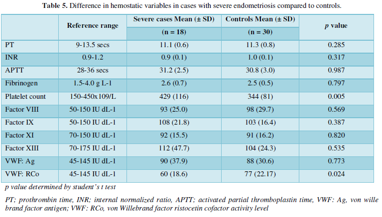 Overall, no significant difference was detected in the mean hemostatic variables between women with endometriosis and controls (Table 4).