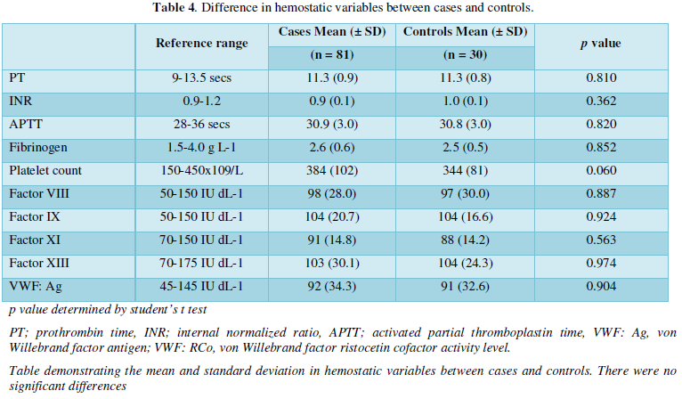 Design, Setting and Patients: A case-control study including women with endometriosis (n=84) and age-matched controls (n=30) was conducted at the Royal Free Hospital. All participants were interviewed to complete Pain Impact Questionnaire (PIQ), and Pictorial Blood Assessment Chart (PBAC). Laparoscopic revised American Society of Reproductive Medicine (rASRM) stage of endometriosis was documented where recorded. Laboratory investigations of hemostasis included platelet aggregation, and coagulation factor levels (VIII, IX, XI, XIII, Von Willebrand Factor (VWF).