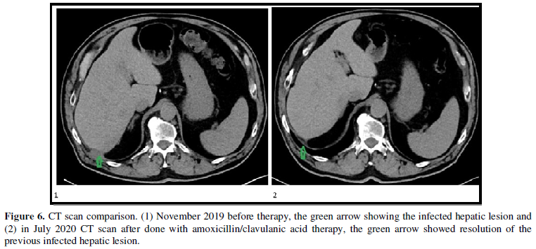 Actinomyces species has remained susceptible to multiple antimicrobials with penicillin being the first choice of treatment [1,5]. Treatment is typically high dose intravenous penicillin for 2-6 weeks followed by 6-12 months of oral penicillin [6]. As noted by Sudhakar et. al, many different treatment regimens have been therapeutic, including treatment with penicillin for 1 week [2]. If the patient has a penicillin allergy, favorable results have been reported with the use of tetracyclines or clindamycin. In majority of cases surgery can be avoided unless medical therapy fails or critical organs are involved. Surgery options vary from a percutaneous drain to removal of the abscess or mass. Resolution of the abscess is monitored by repeat imaging, usually CT scan [4]. In this particular case, the patient experienced a positive outcome after correct diagnosis and treatment with oral Augmentin for 6 months with a total resolution of the perihepatic abscess as it was seen in the follow up CT scan. As with many other infections, the antibiotic therapy for actinomycosis cannot be made uniform across all patients but instead must be personalized based on the length and severity of the disease.