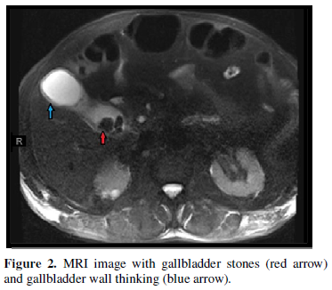 Magnetic resonance imaging (MRI) with magnetic resonance cholangiopancreatography (MRCP) with and without intravenous contrast was completed resulting in evidence of cholelithiasis with gallbladder wall oedema and trace fluid concerning for acute cholecystitis. However, the biliary system did not show any significant findings (Figure 2).