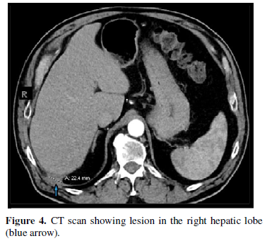 Repeated CT scan of the abdomen and pelvis with and without contrast in November 2019 showed small persistence of soft tissue density focus posterior to the right hepatic lobe with slight increase in the size to 2.2 cm (Figure 4).