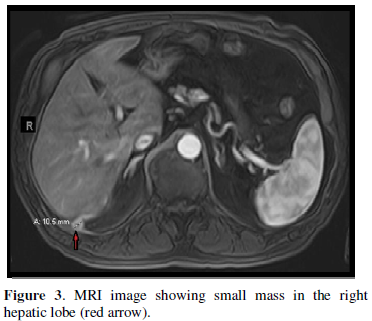In May 2019, the patient’s primary care physician obtained a CT scan of the abdomen and pelvis without contrast due to intermittent dull and mild right upper quadrant abdominal pain. Per the CT scan report there was an unidentified liver lesion measuring 1.3 x 1.5 cm. Thus, the patient was referred to an oncologist in July 2019 due to a concern of hepatocellular carcinoma. The patient’s oncologist initiated work up which resulted in an alpha fetoprotein (AFP) of 4.7 nanogram per milliliter (ng/ml), that was within normal limits, and a negative acute viral hepatitis panel. MRI with and without contrast of the liver showed an area of abnormal signal and enhancement within the inferior medial aspect of the right lobe of the liver with ring enhancement measuring 1.5 x 1.0 centimeters (cm) (Figure 3).