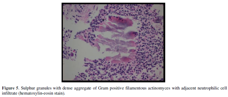 Actinomycosis is caused by the actinomyces species of gram positive, non-spore forming and is facultative anaerobic bacteria. It is chronic granulomatous disease [11]. It catechizes with sulphur granules and branching filamentous cells. Usually, the granules’ color is yellow.