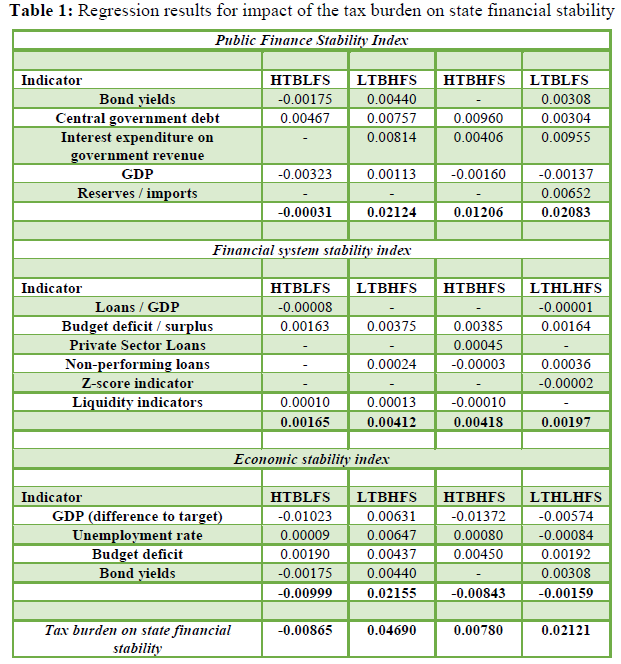 Indices of the total tax burden and the constituting indices of the different types of taxes were calculated for these clusters of countries. Indices of the tax burden, the public finance stability, the financial system stability and the economic stability were used in the correlation analysis to examine the interaction and interrelation between the overall tax burden and state financial stability. The impact of the tax burden on the state financial stability has been examined using multiple linear regression analysis. During analysis regression models were formed for each indicator of public finance stability index, financial system stability index and economic stability index using time series data. Regression models are provided in appendices (Table A1, Table A2, Table A3). Tax burden was used as one of the independent variables, therefore coefficients of tax burden variables in the regression models were selected as measure of impact. In cases when statistically significant models were formed only without independent variable of tax burden, it was considered that tax burden has no impact to the dependent variable, e.g., indicator, which is used in calculation of public finance stability, financial system stability or economic stability indexes. Using coefficients assigned to independent variables of tax burden impact to public finance stability, financial system stability and economic stability was calculated according to weights of indicators in the indices (Table A4). Finally, using data of impact to indices, tax burden impact to state financial stability was calculated (Table 1).