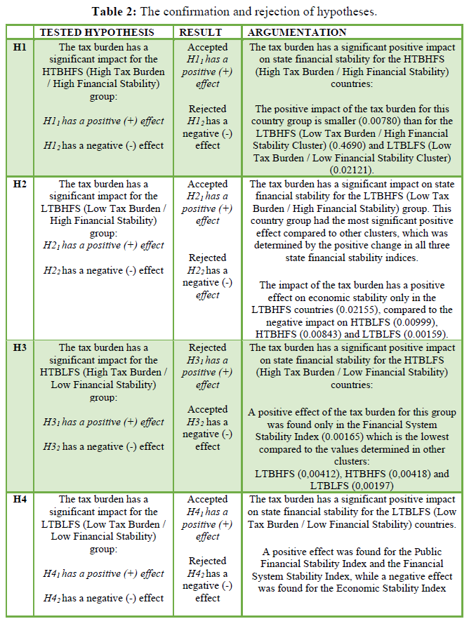The complexity of the model is revealed through different levels of state financial stability and tax burden assessment. The model has been designed for applicability in an international environment and is therefore suitable for research in individual regions or groups of countries. The impact assessment methodology uses a linear multivariate regression equation, hierarchical clustering and other econometric / statistical methods. These research methods have been chosen as reliable instruments for the purpose and scope of this paper and are generally recommended by the scientific literature for the investigation of the effects and causal relationships between variables.