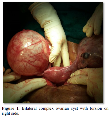 A multiparous patient of age 32 years reported with lower abdominal distension since 1 month and pain abdomen since a day. On per abdominal examination there was a mass corresponding to 16weeks gravid uterus with irregular surface and free side to side mobility. The lower border could not be reached, thus seem to arise from pelvis. There was tenderness in right iliac fossa with guarding. Per vaginal examination showed bilateral forniceal fullness with tenderness in right fornix. Ultrasonography showed a bilateral complex cystic lesion arising from ovaries with torsion on right side. Emergency Laparotomy was done and on frozen section the tumor was confirmed to be of benign nature. Right side salphingo-oophrectomy was done along with left side ovarian cystectomy was done. Histopathological examination of the specimen confirmed it to be bilateral serous papillary cystadenofibroma with torsion on right side.