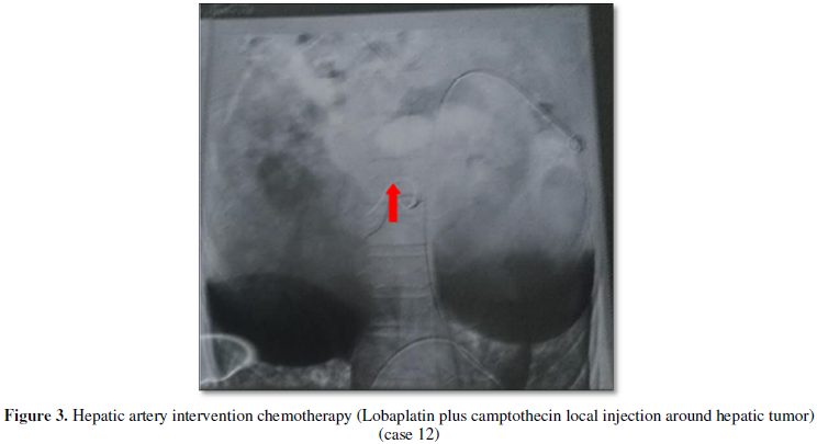 Case 12: A 41 year old man stated that he was disgusted with taste of greasy, accompanied with nausea and vomiting for one month, and chief complaint of abdominal mass one day ago. At physical examination showed 6 × 5 cm harden mass in his hepatic lesion, and an enlarged liver was felt 7 cm below the right costal margin. Laboratory data included serum AFP 40.59 ng/ml (control 0-7 ng/ml), CEA 5.86 (control<5.0 mg/L), CA-125 63.0 (control<35.0 u/ml), CA-159 91.31 (control<35.0 ku/L), serum HBsAg (-), serum HBsAb 53.3 (+), serum HBeAg (-), serum HBeAb 1.29 (+), serum HBcAb 1.45 (+). He was diagnosed as advanced HCC. Treatment consisted of hepatic artery intervention chemotherapy (Lobaplatin plus camptothecin injection, Figure 3) in another provincial tumor hospital and demethylcantharidin tablets. He was in stable disease for 3 months and now being treated in other hospital.